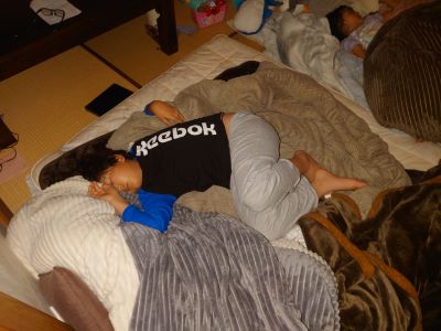 そのまた隣で寝ていた息子が妹に打ち下ろし式の蹴りを入れてました。
