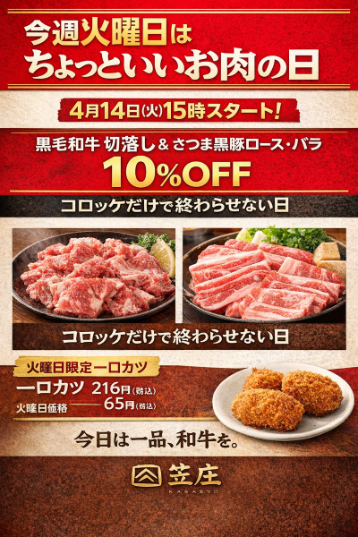 今週も火曜日のタイムセールをヨロシクお願い致します。