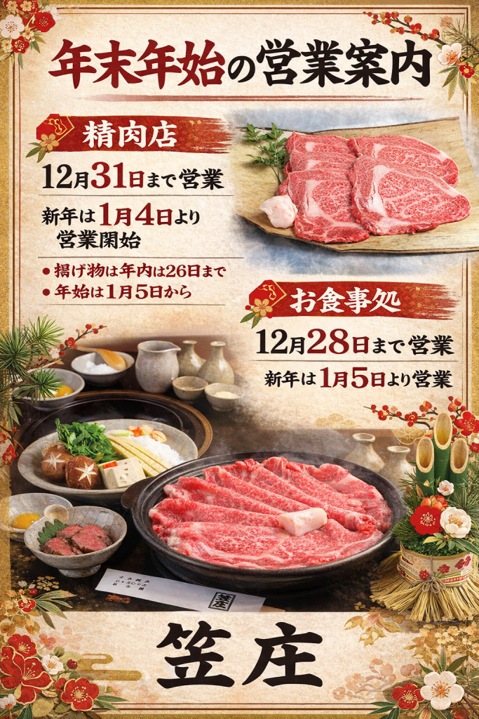 1階・精肉店 年内12月31日まで営業となり、年始は1月4日からの営業です。